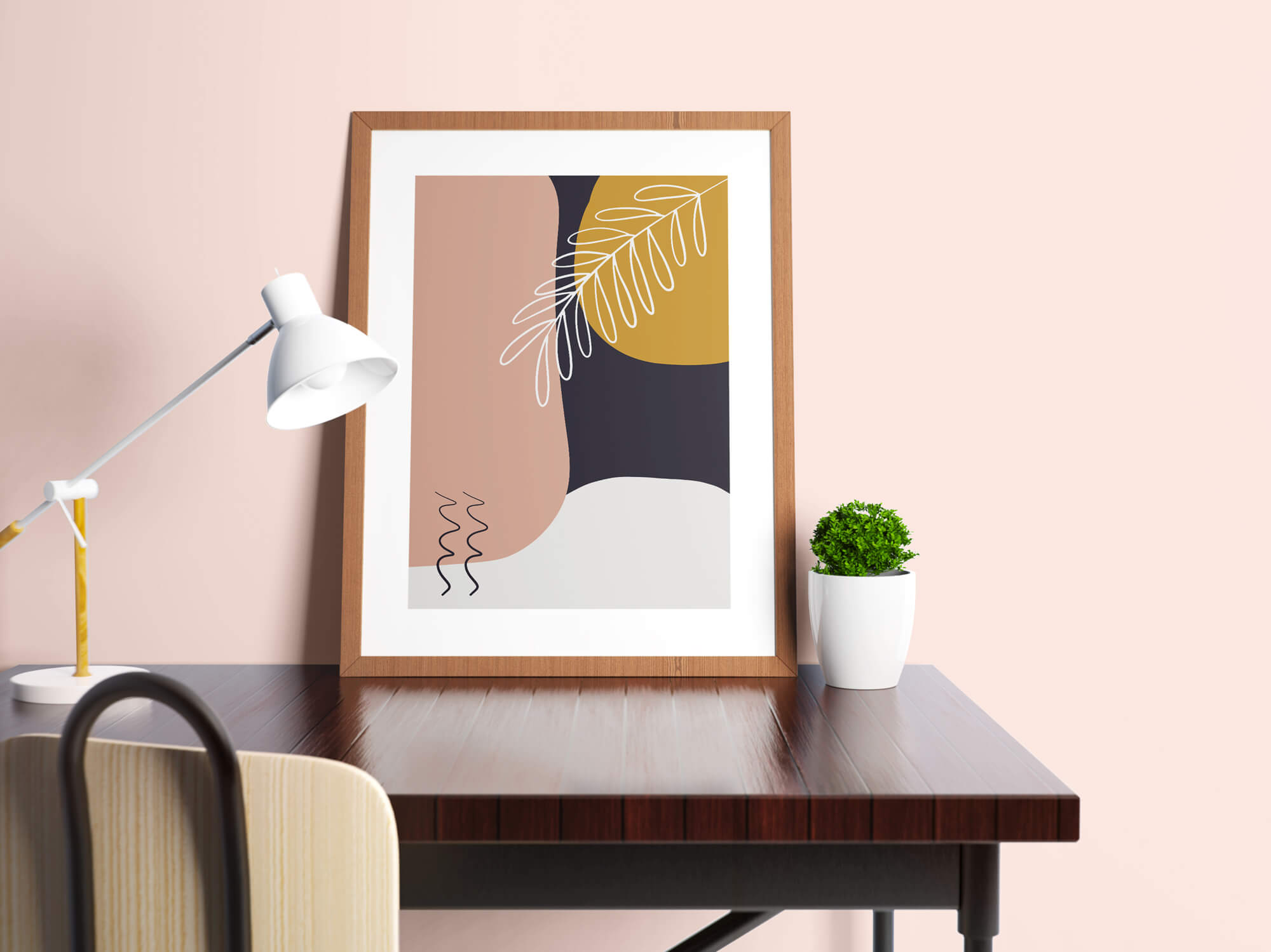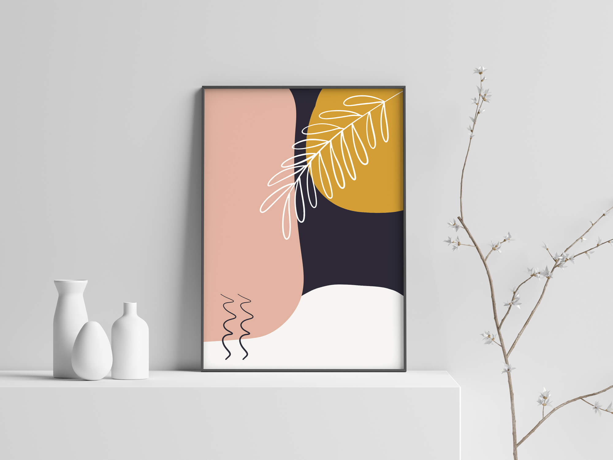 Van deze abstracte vormen poster met botanische line art wordt je helemaal vrolijk! Fleurige kleuren die goed met elkaar combineren en een wit line art takje. De poster maakt gebruik van zowel frisse als warme kleuren. De donkerblauwe kleur maakt een mooi contrast met het warmere roze en oker geel. De off white abstracte vorm zorgt voor een frisse touch.
