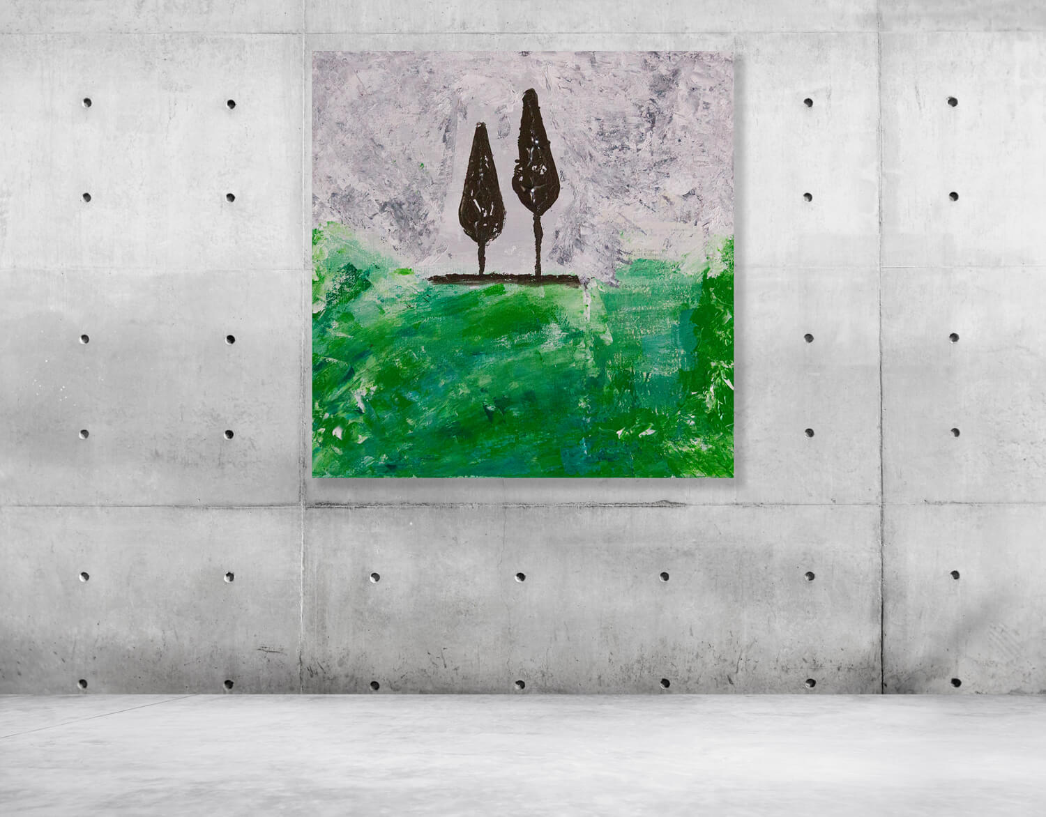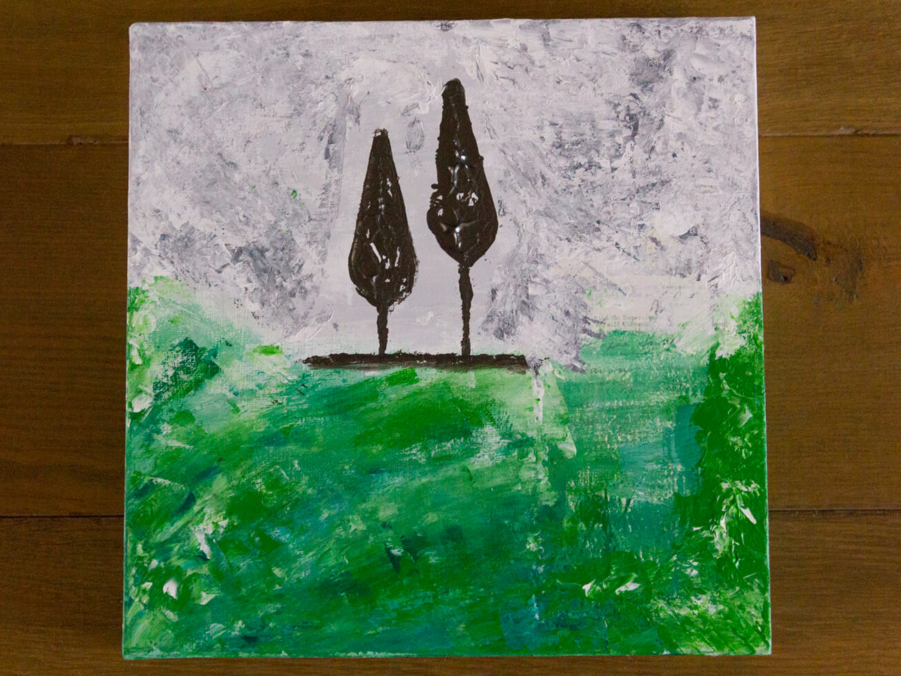 Abstract Stormy Landscape is een modern, abstract schilderij van een stormachtig landschap. Past perfect in een industrieel en modern interieur. Dit werk maakt gebruik van meerdere tinten groen, (licht)grijs en wit. Lagen verf en papier zorgen voor textuur. De bomen zijn grafietkleurig wat mooi contrasteert bij het groen van het landschap. Door gebruik van het paletmes hebben de bomen een bijzondere structuur.