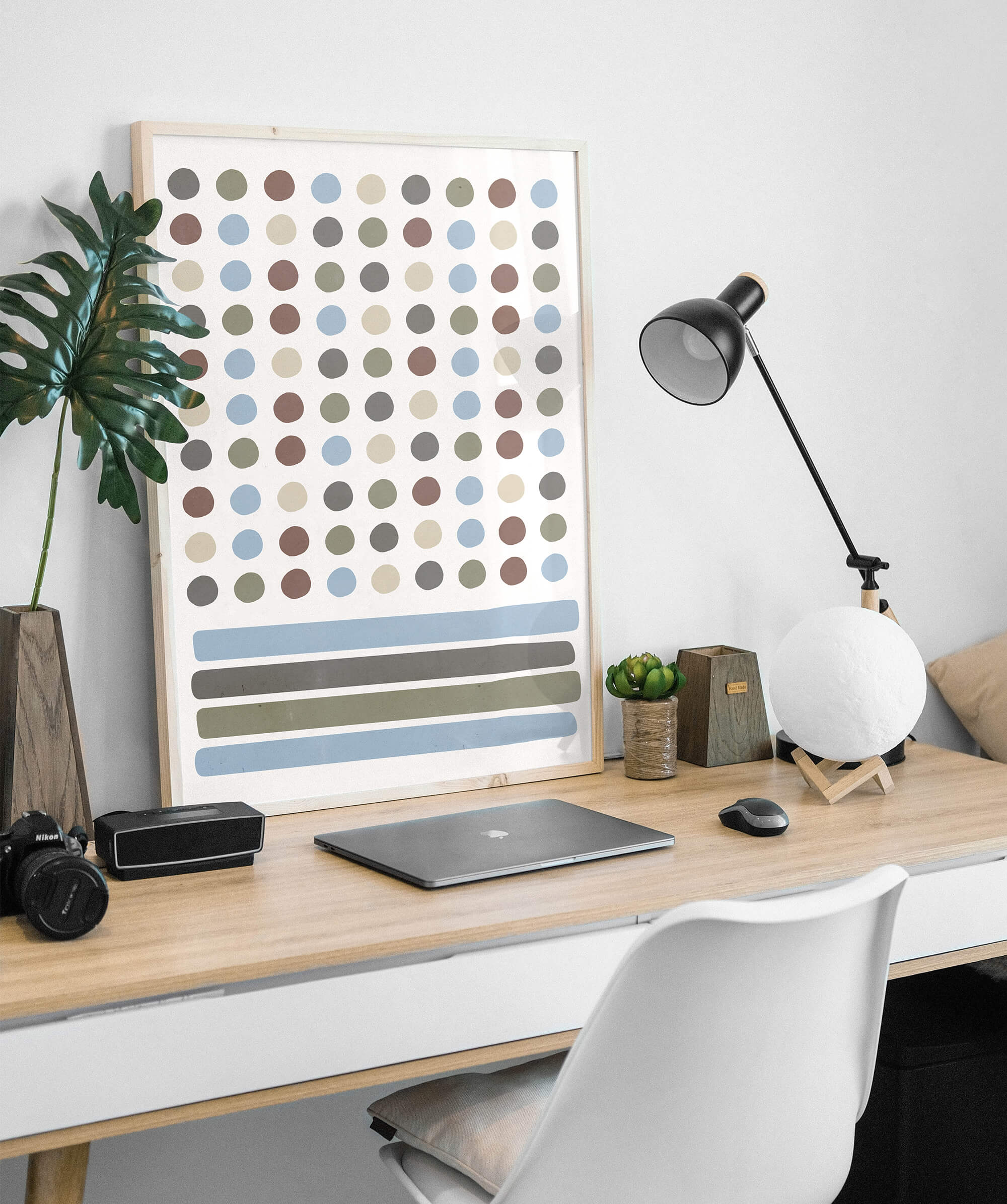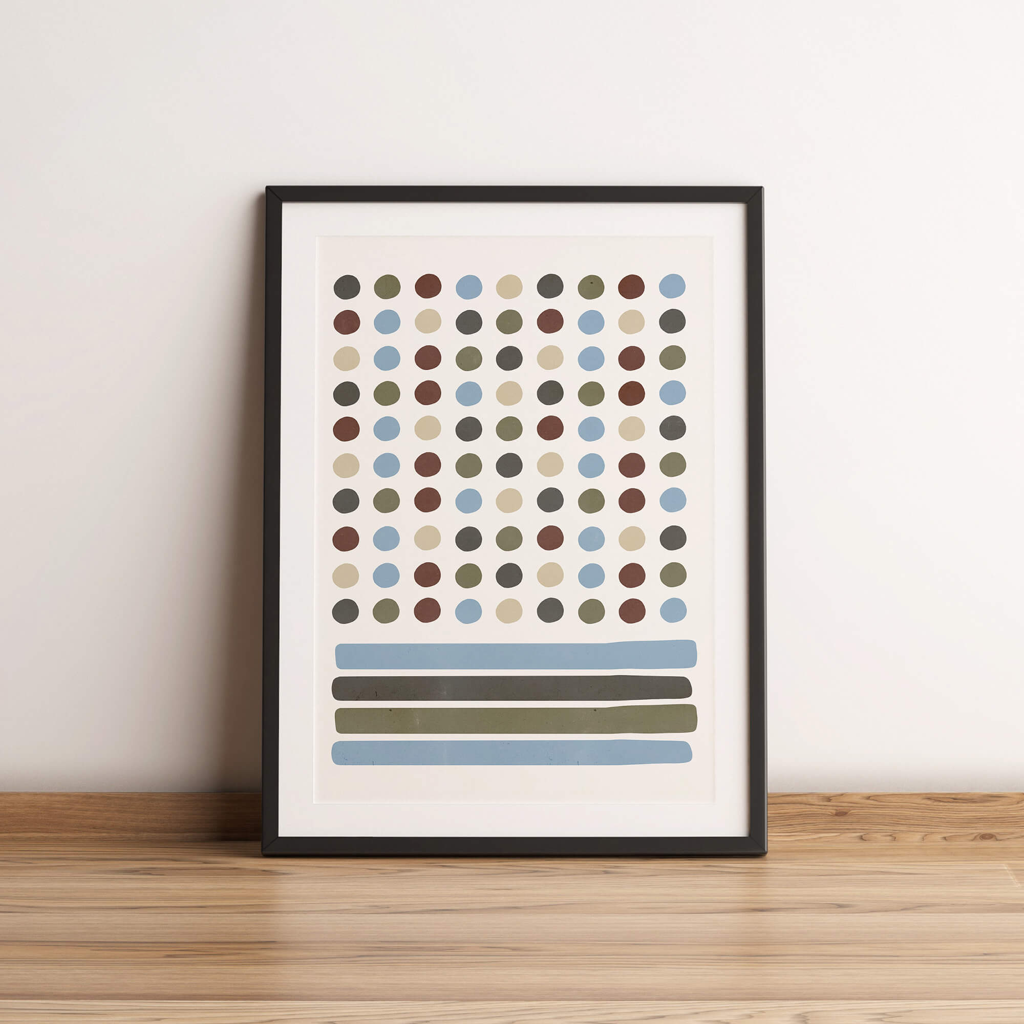 Colorful Pattern is een kleurrijke patroon poster en canvas print met abstracte vormen. Het patroon wordt onderaan verbroken door 4 abstracte lijnen. Met blauw, beige, bruin, donkergrijs en groen een kleurrijk en vrolijk geheel. Een poster om vrolijk van te worden!