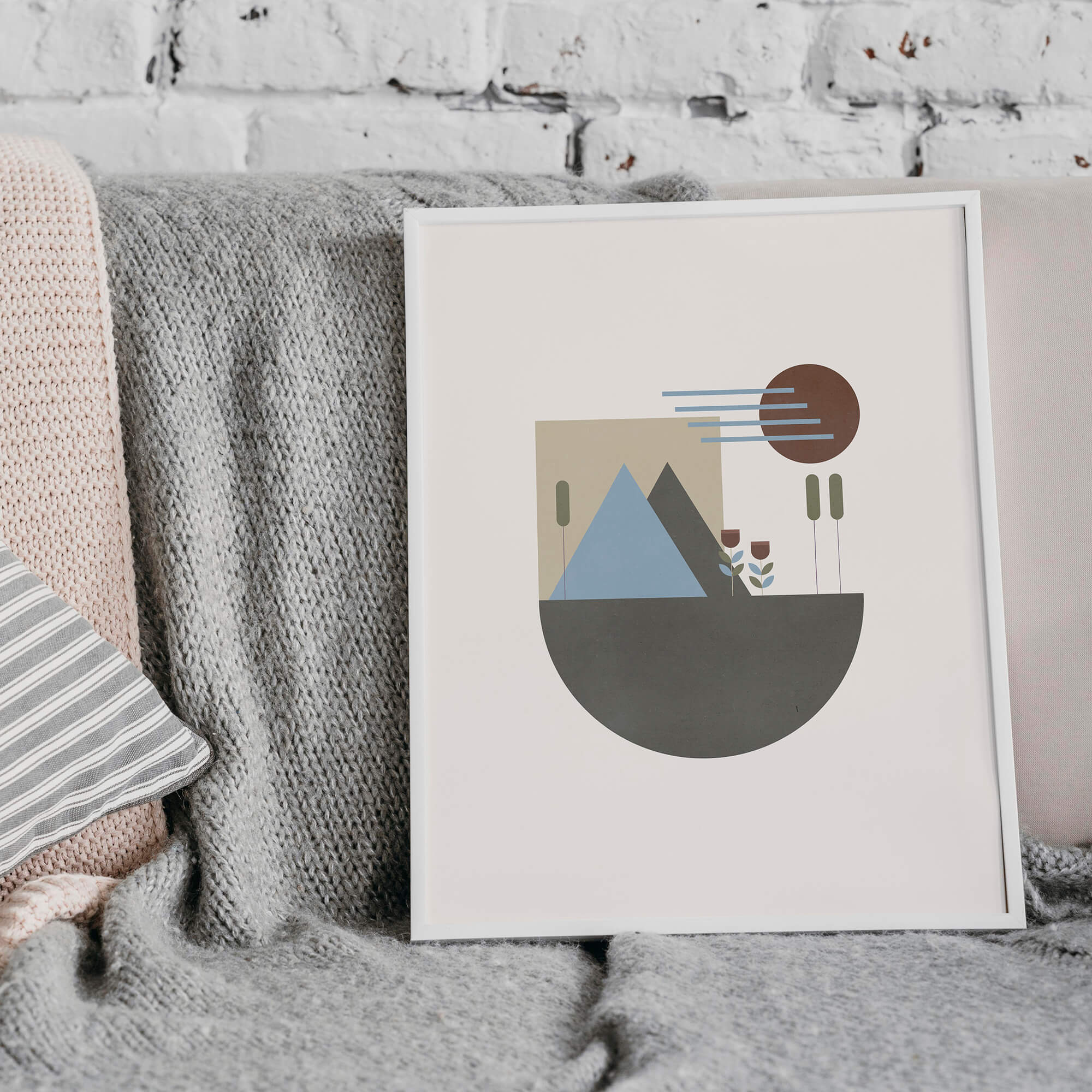 Scandinavische Poster en print met een geometrisch landschap. Het berglandschap is opgebouwd uit geometrische vormen zoals cirkels, halve cirkels en een vierkant. Naast bergen zijn ook illustraties van twee abstracte bloemen en drie abstracte bomen, beiden gemaakt van geometrische vormen. Het kleurgebruik is fris en vrolijk.