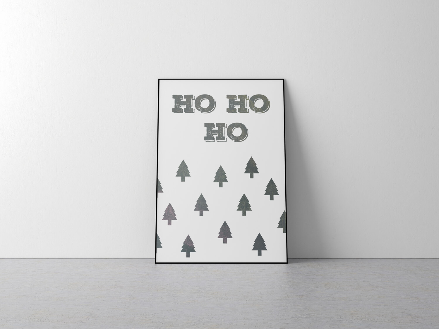 Industriële kerstposter met kerstbomen patroon en de tekst “Ho Ho Ho”. De tekst en de kerstbomen hebben een subtiel krijtbord textuur voor een vintage look.