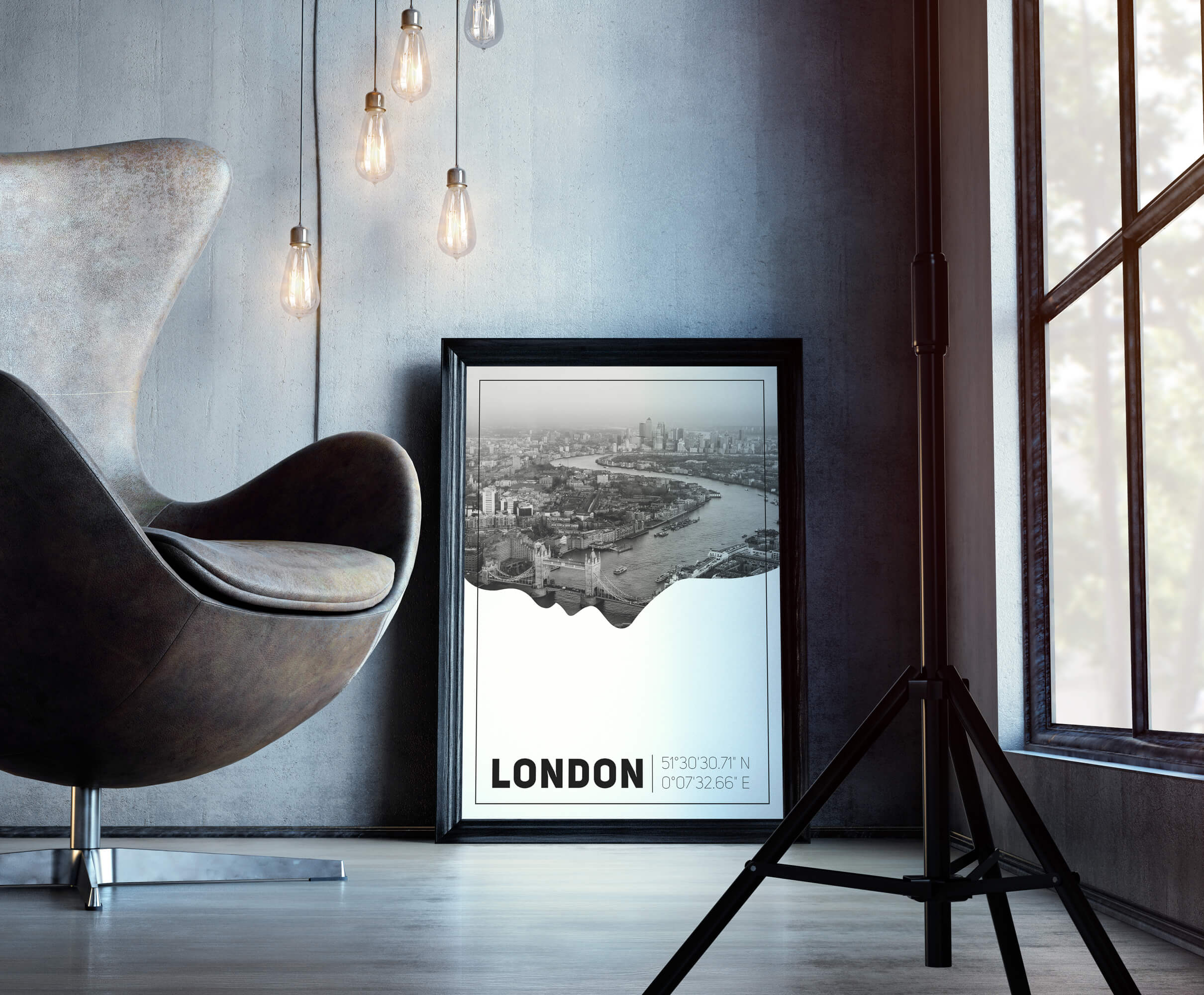 Industriële London poster met het silhouette van een vrouwenhoofd met daarin een mooie foto van de stad. In een stoer lettertype de coordinaten en naam. Het lettertype geeft deze poster en print, zeker in zwart-wit, ook wat industrieels. Verkrijgbaar in 3 maten en in kleur en zwart-wit.