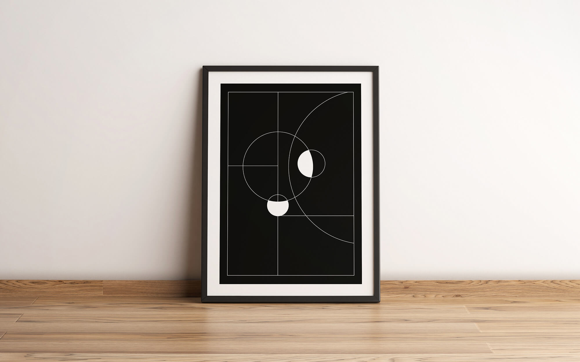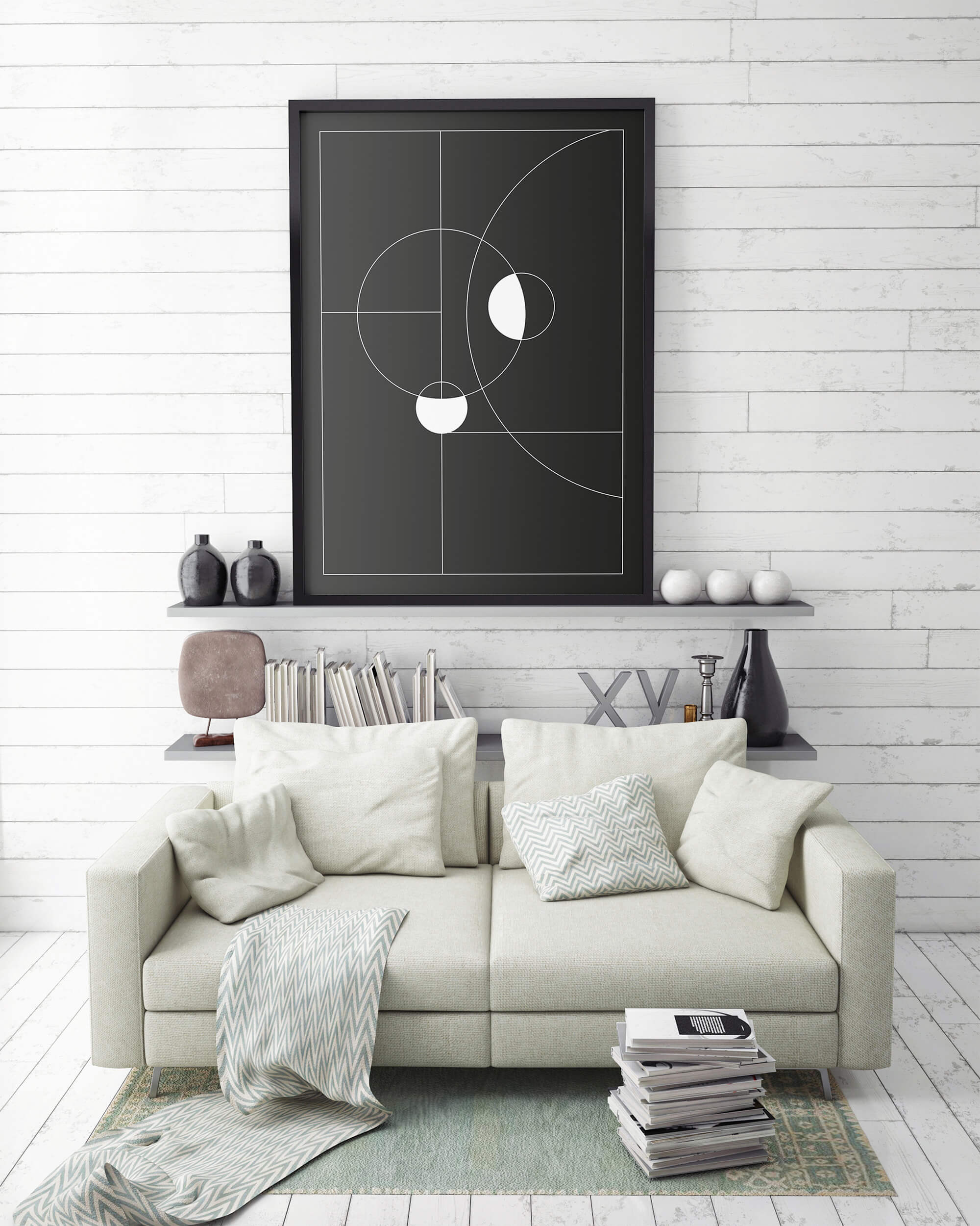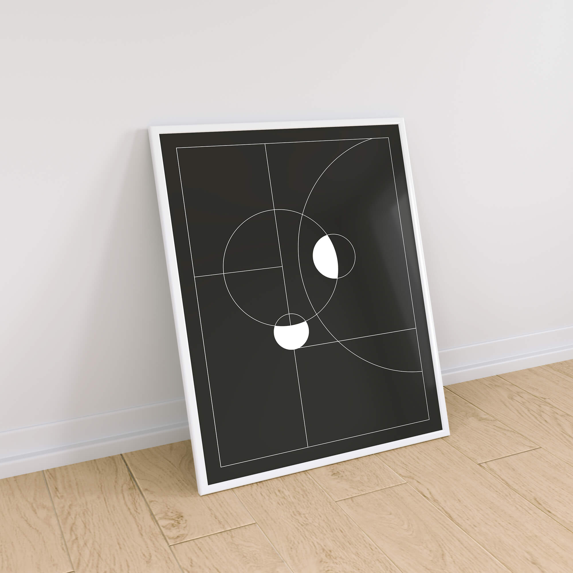 Leuk geometrische en minimalistische zwart-wit poster en print. De compositie wordt opgebouwd uit witte lijnen en cirkels. Een zwart-wit print in Scandinavische stijl voor aan je muur.
