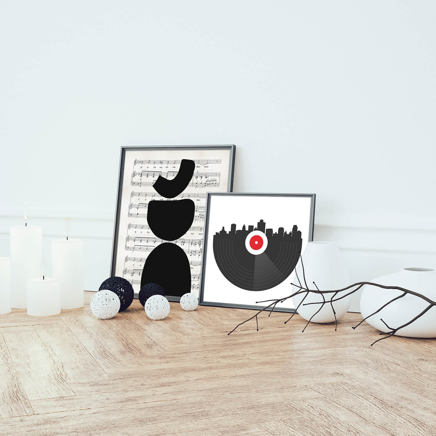 Deze minimalistische muziek posters set is leuk voor muziekliefhebbers. Een set van twee gave muziek prints in zwart-wit met 1 staande en 1 vierkante poster. Vinyl City is een vierkante poster waarbij een LP samen komt met het silhouet van een stad. Abstract Music is een abstracte poster in staand formaat met abstracte vormen op bladmuziek.