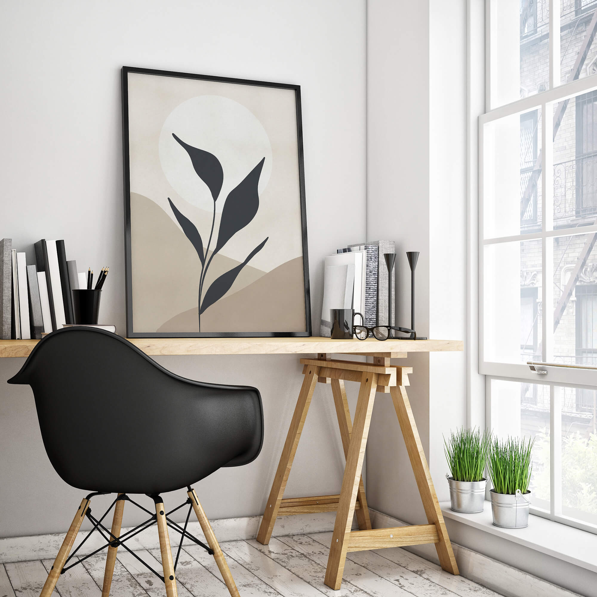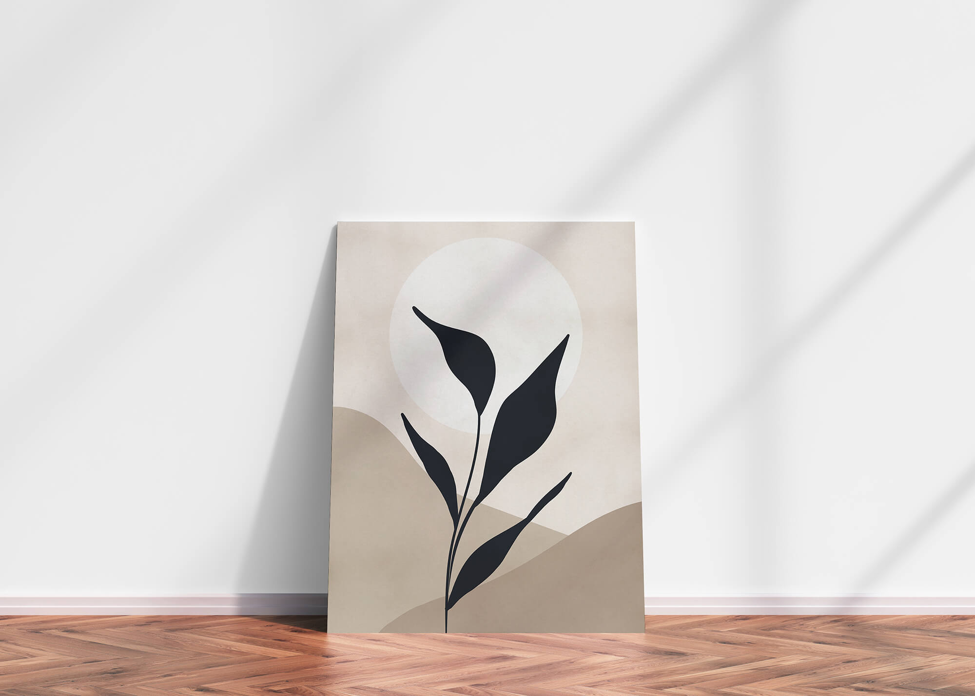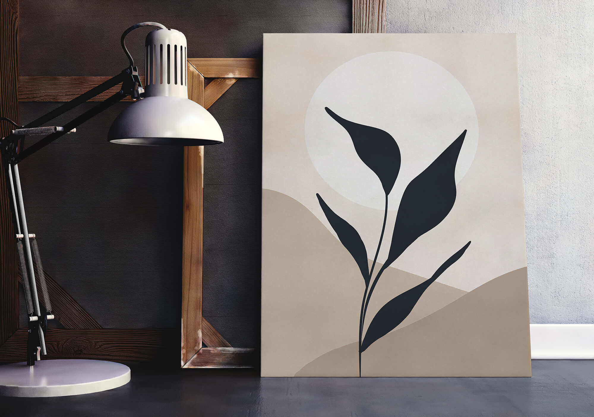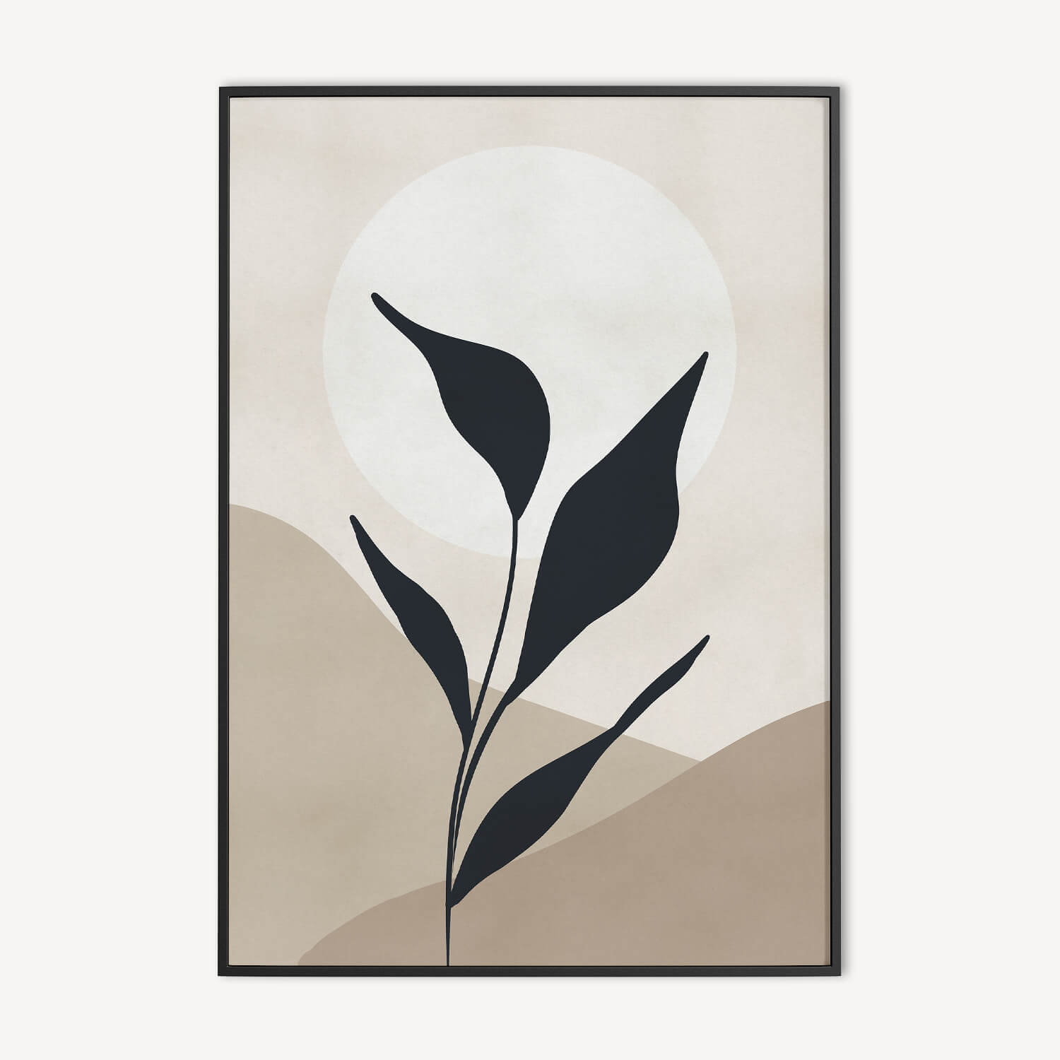Leuke abstracte poster en canvas print in minimalistische stijl. Voor de print zijn neutrale kleuren zoals bruin, beige, wit en zwart gebruikt. Een abstract landschap met op de voorgrond een silhouet van een tak met blaadjes.