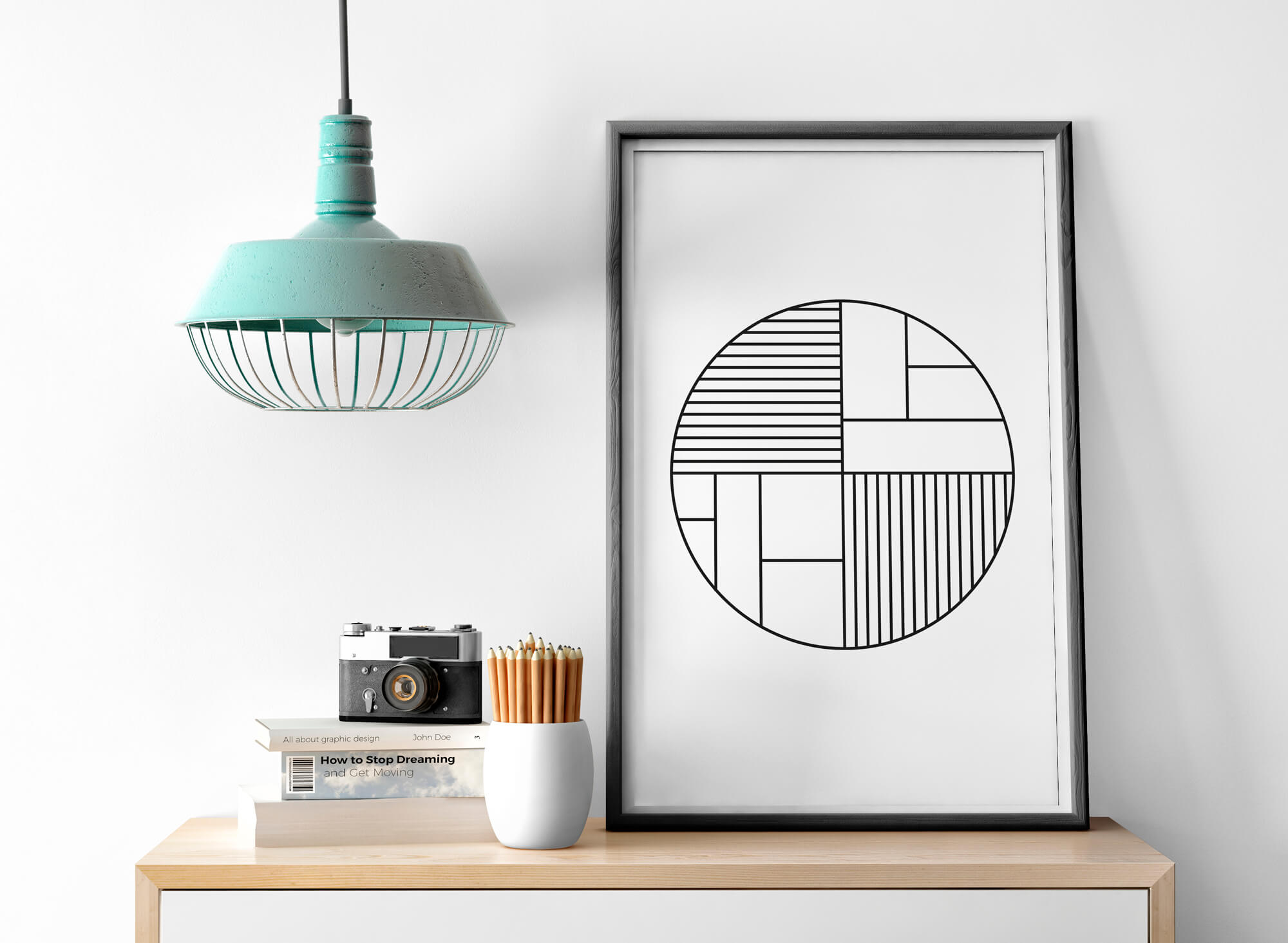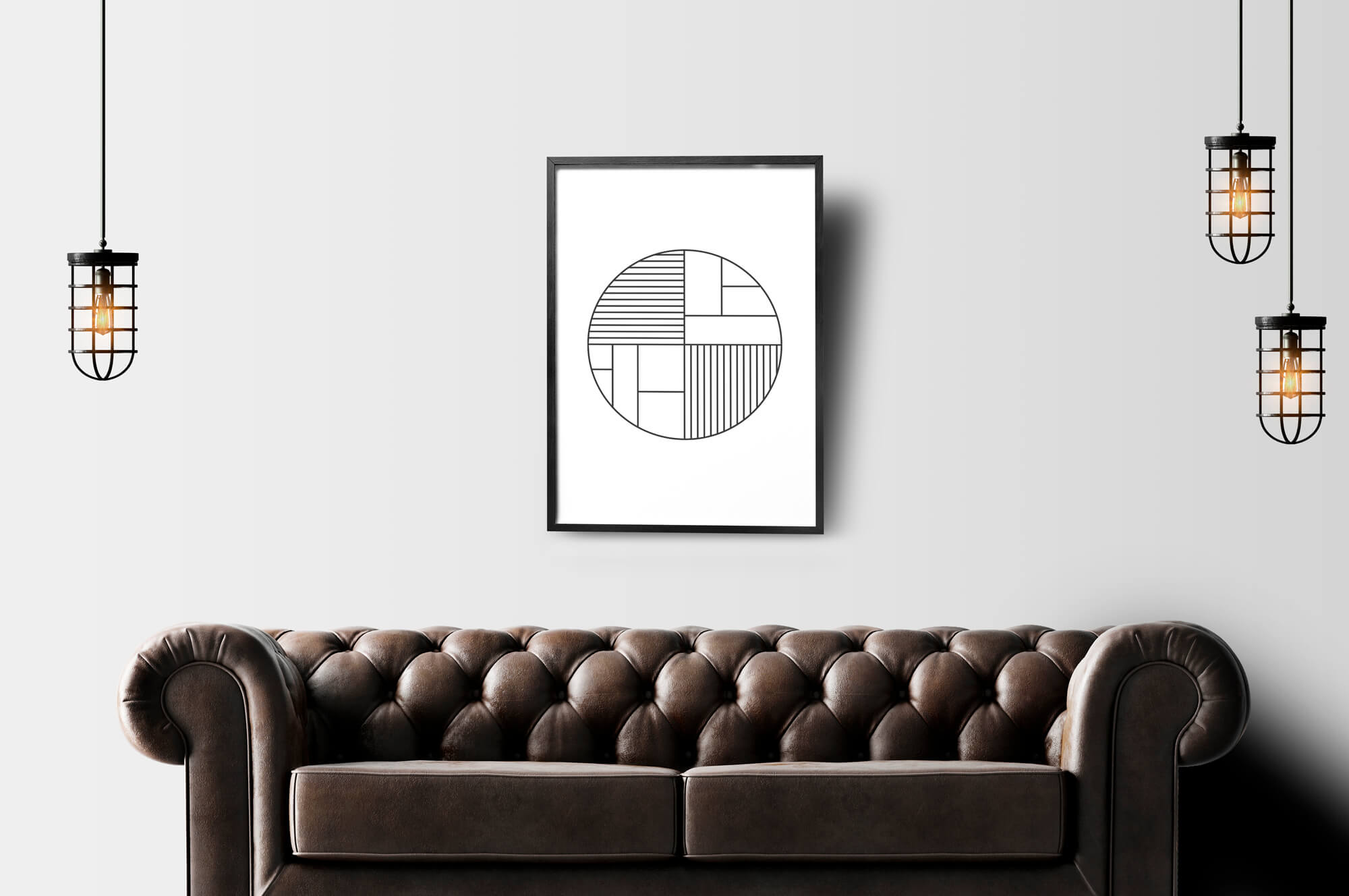 Minimalistische cirkel poster en print met geometrische elementen. In stijlvol zwart en wit. Ook verkrijgbaar met een zwarte achtergrond en een witte cirkel.