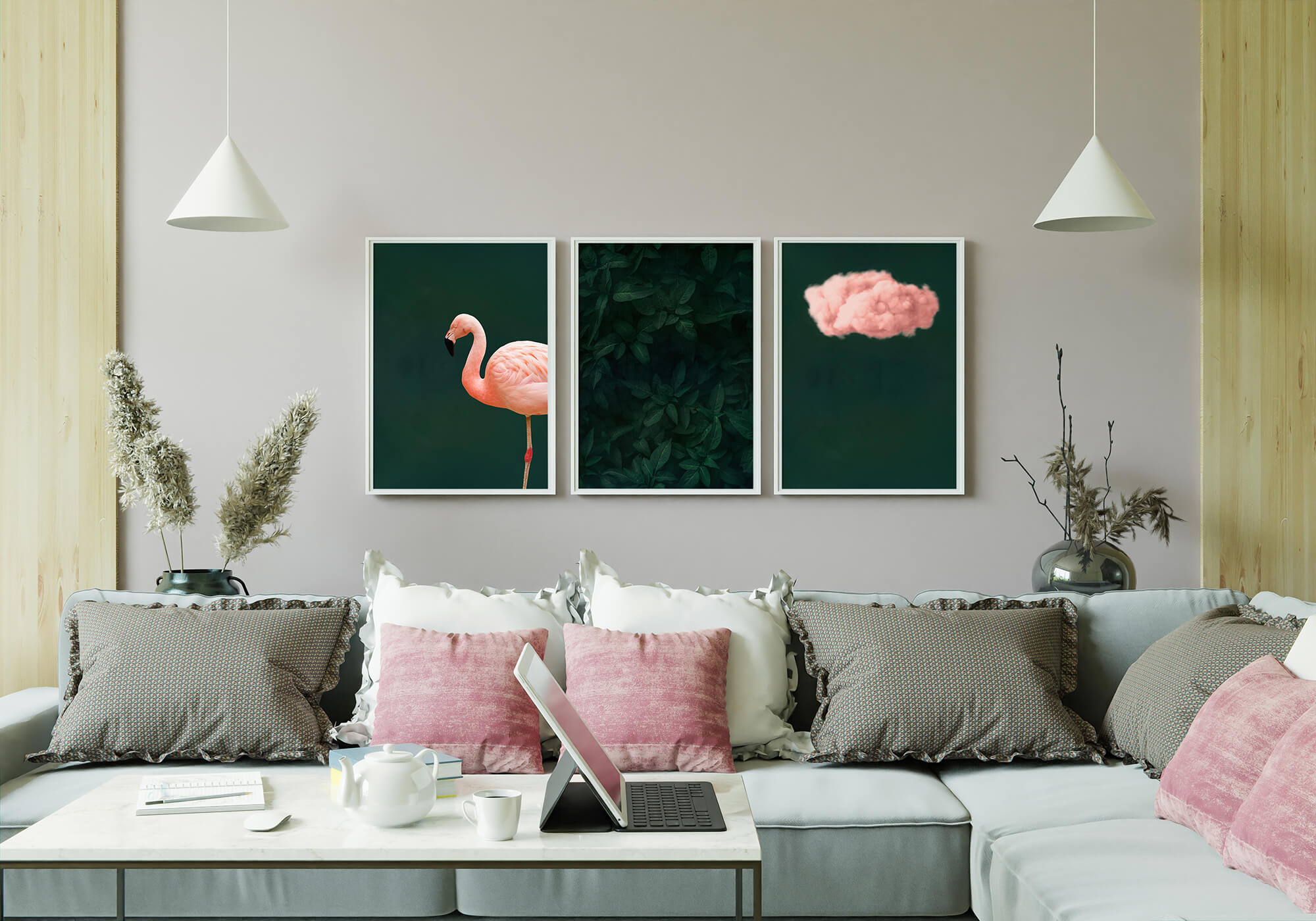 Creëer een gave fotowand met deze poster set van 3 smaragdgroene posters. Op twee posters worden groen met roze combineert. De botanische poster in het midden is een rustpunt. Op onze fotowanden en posters sets krijg je altijd 10% – 20% korting.