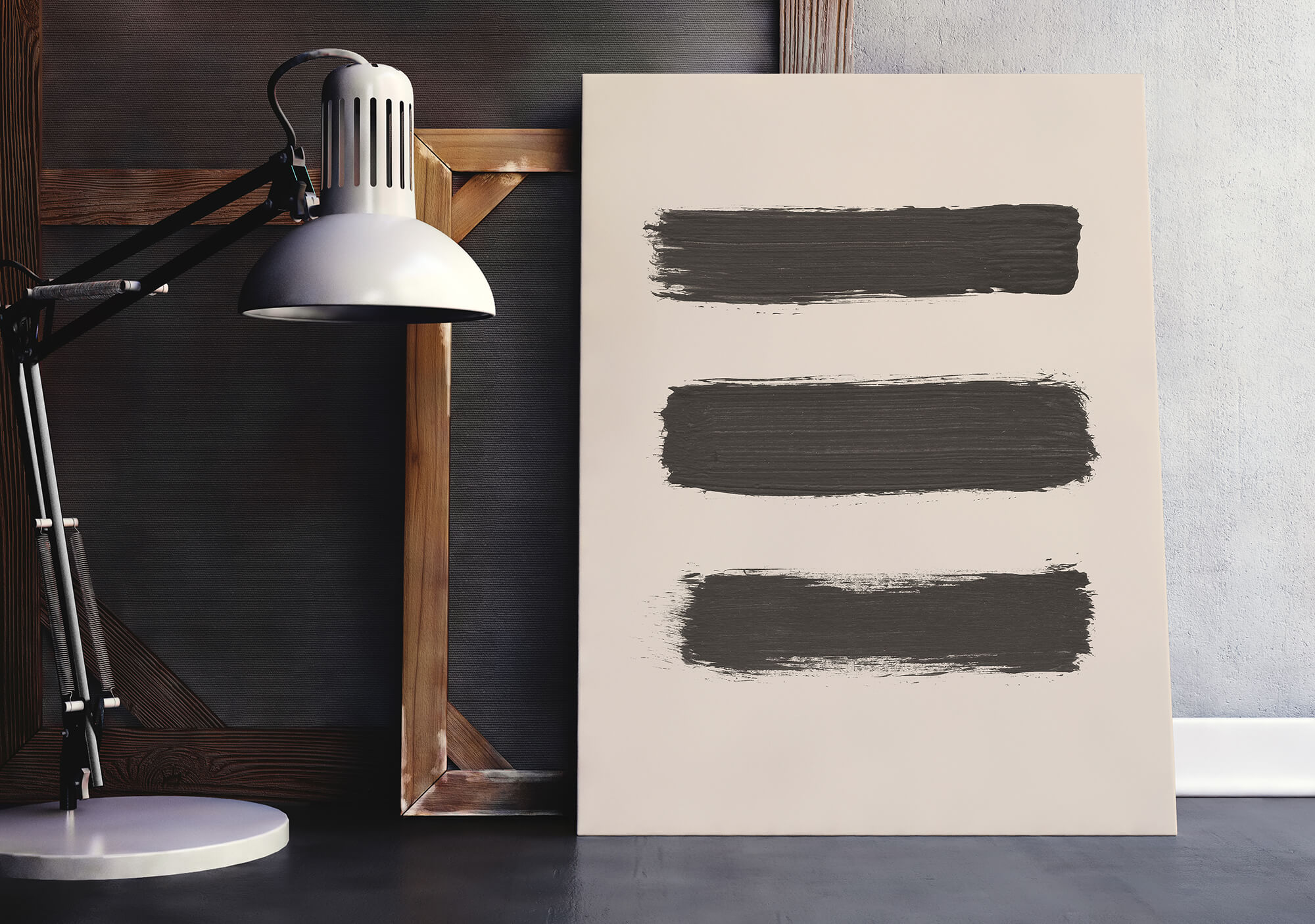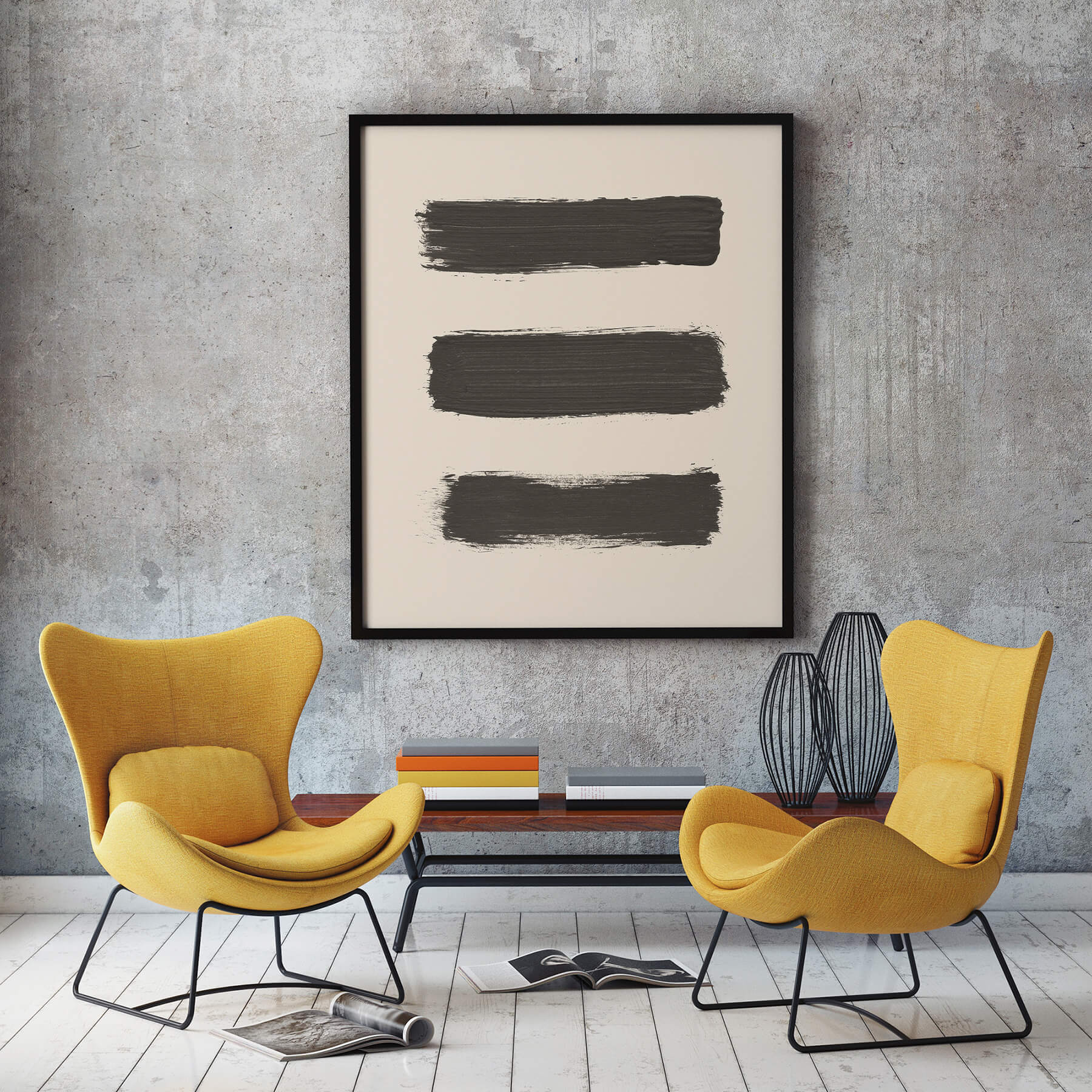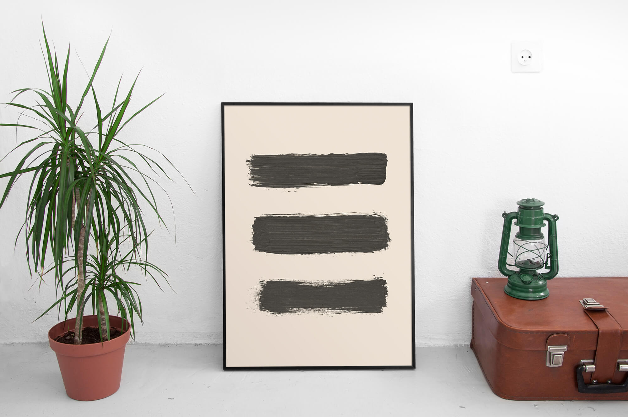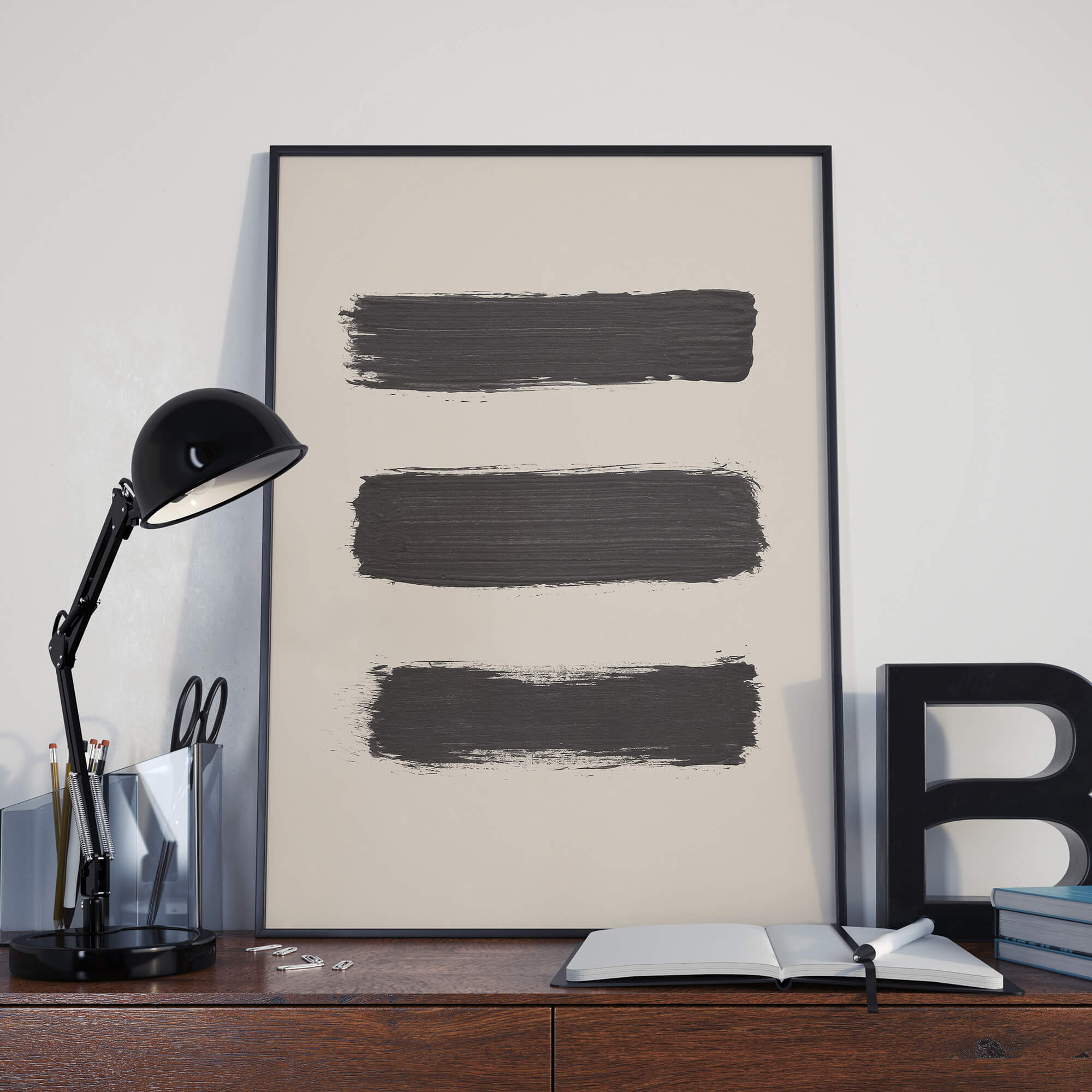 Three Brush Strokes in een poster met 3 penseelstreken in zwarte verf op een beige achtergrond. Een mooie abstracte, minimalistische poster en canvas print in Scandinavische stijl. Deze trendy en stijlvol poster en print past in elk interieur.