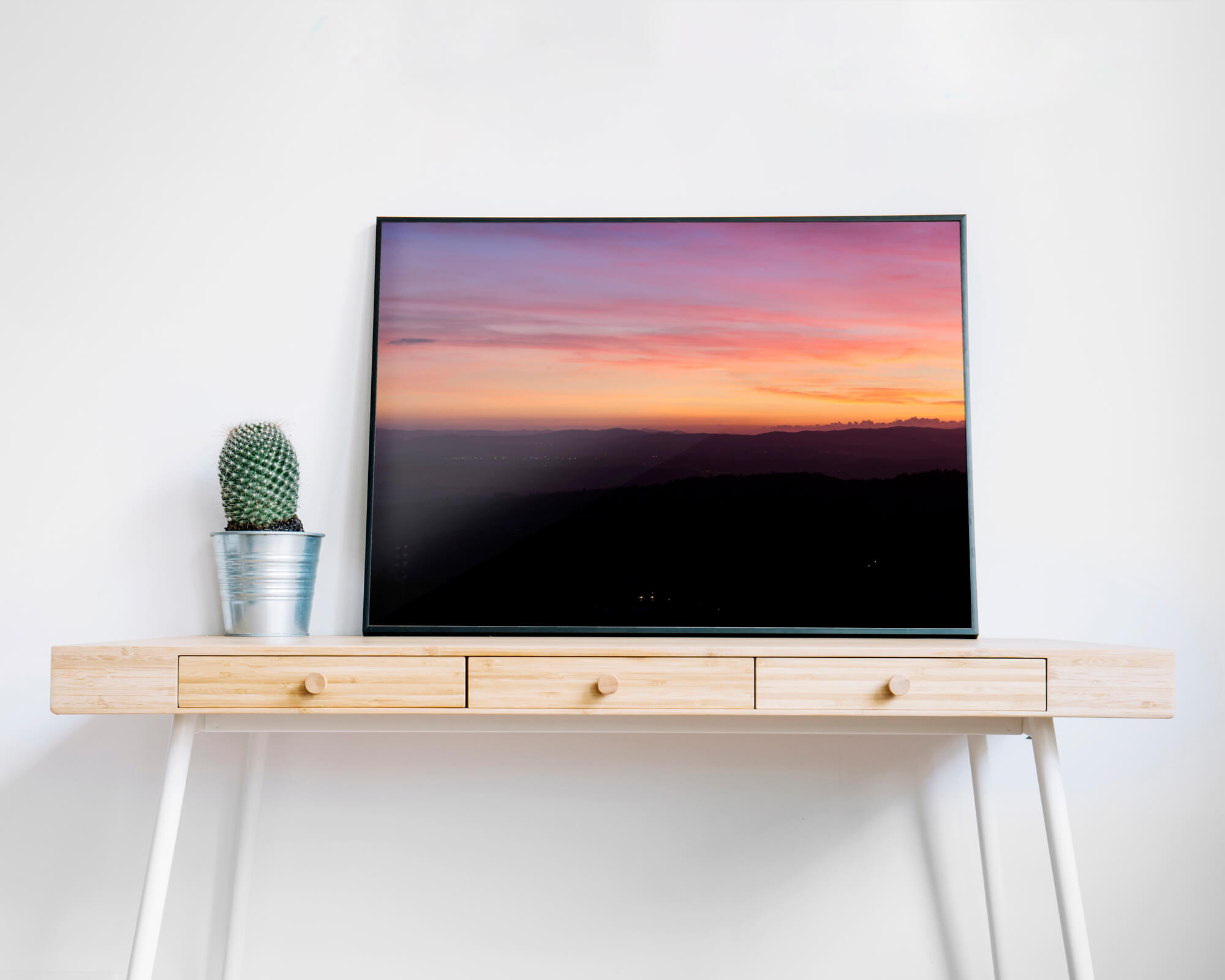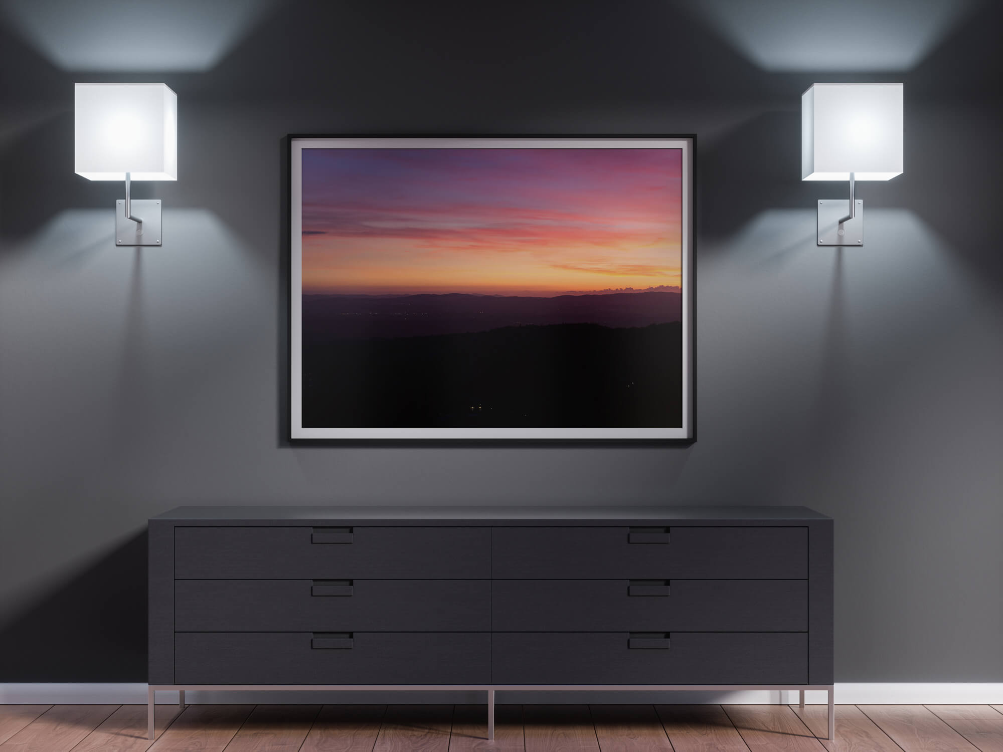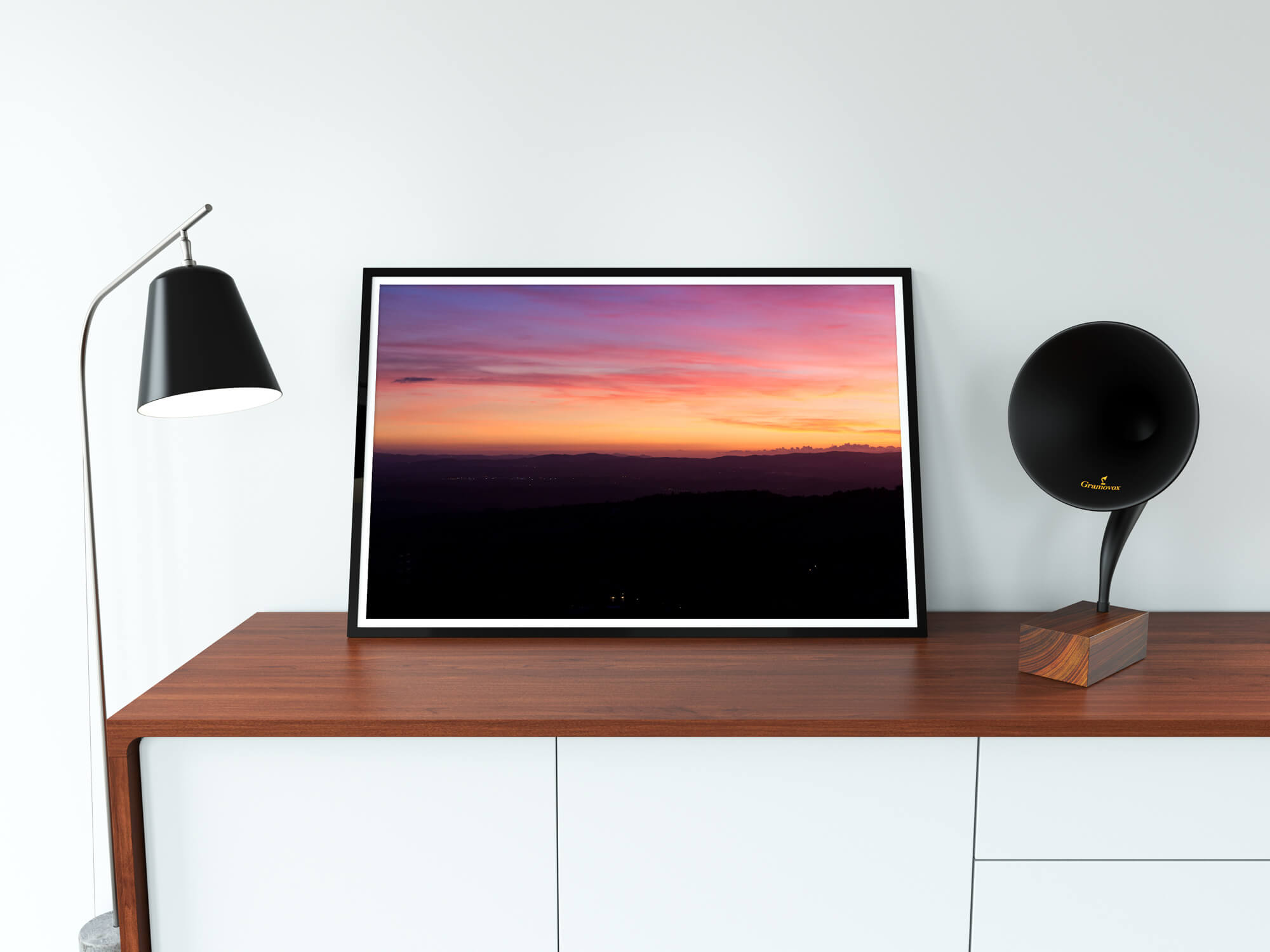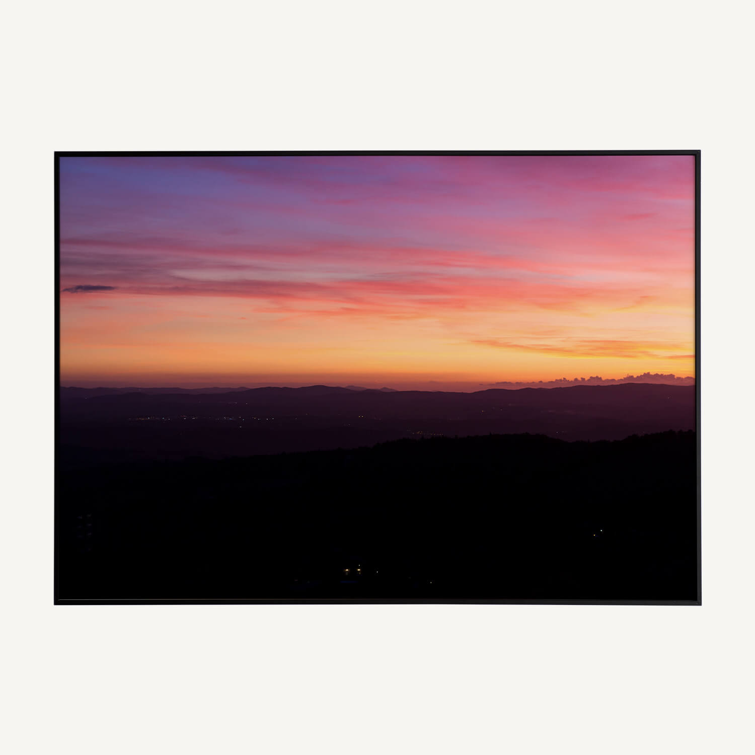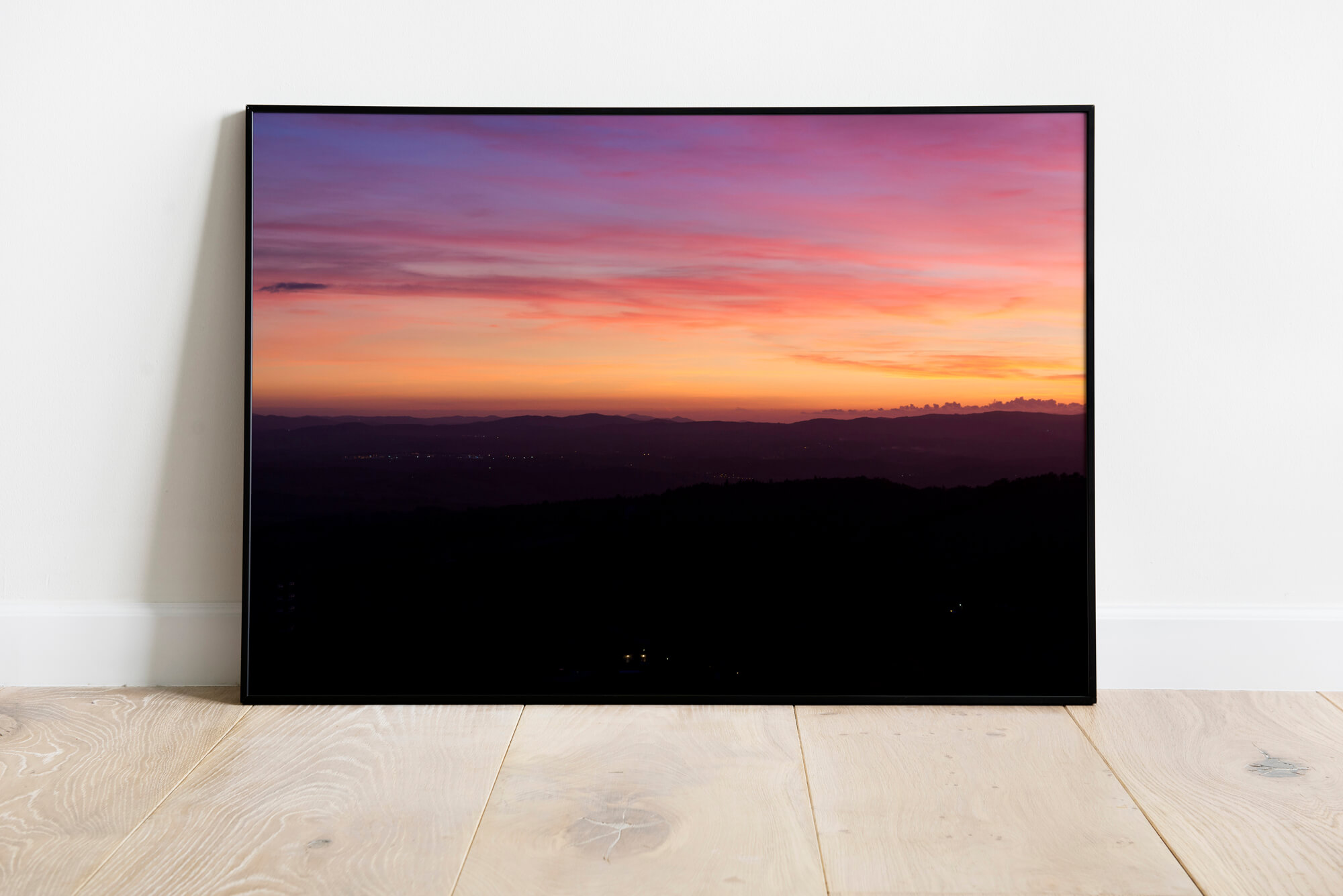 Zonsondergang poster en canvas print met prachtige kleuren. De lucht kleur paars, oranje en een beetje blauw terwijl de voorgrond al in donker gehuld is. De foto is genomen in de Chianti streek in Toscane en is dus een echte Toscaanse zonsondergang!
